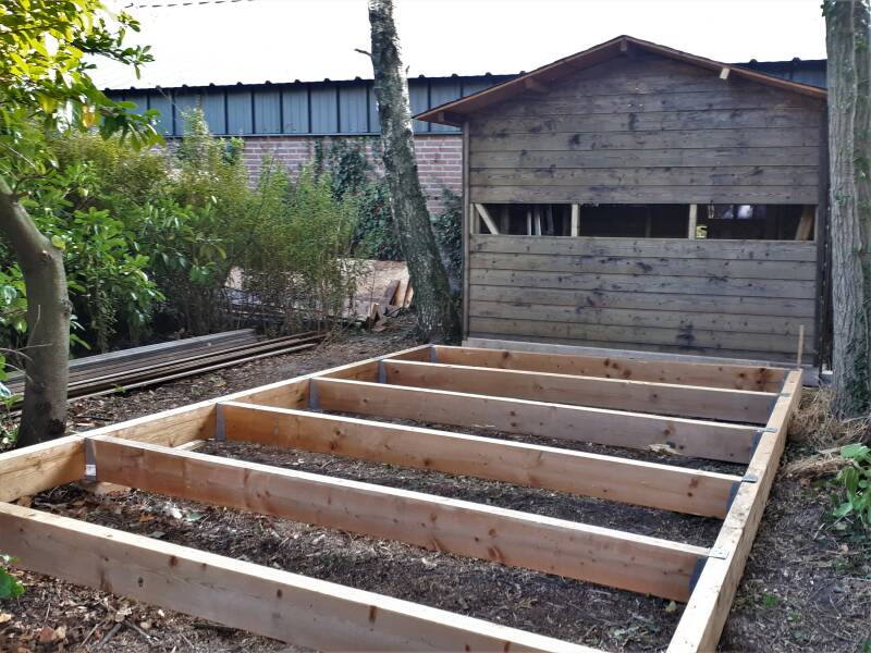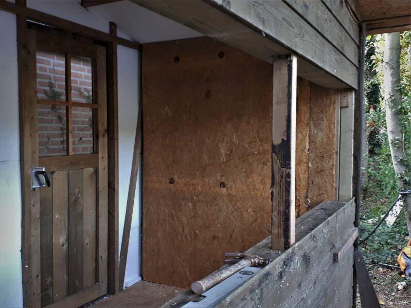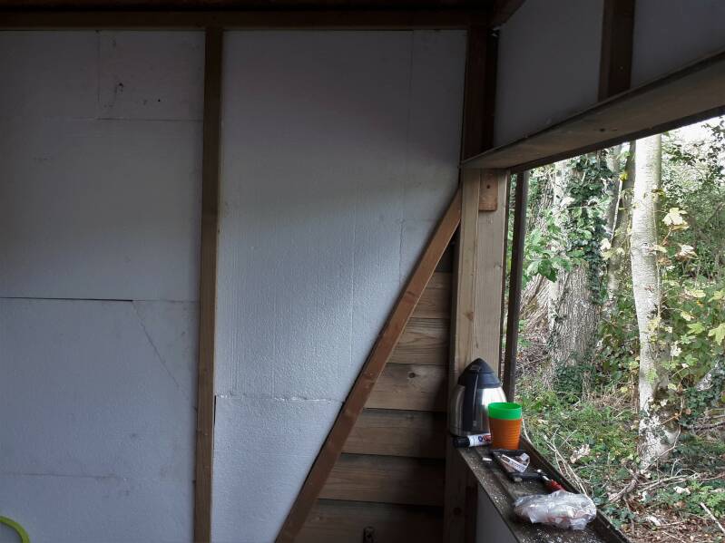 2020 > Dit is de tweede hut die ik bouw, een half jaar na de eerste. In juni had ik al een mooie plek in Sterksel maar uiteindelijk werd er bezwaar gemaakt door een buurman dus moest ik op zoek naar een andere locatie. Het was begin september 2020. Ongeveer twee kilometer verderop kreeg ik een mooie stekkie aangeboden. Eerst natuurlijk goed de omgeving bestudeerd. Waar komt de zon op, hoe is het licht en welke bomen of struiken moeten wijken. Aan de achterkant van de zeker tachtig meter lange schuur kon ik de hut gaan plaatsen. Aan de hand van mijn eerste ervaringen met het bouwen van een vogelhut kon ik aan de slag. Maatvoering, vijverhoogte, zithoogte en plaatsing van de statieven zijn zeer belangrijk. Eerst heb ik het huisje in elkaar gezet en er een nieuw dak op gelegd dat aan alle kanten flink oversteekt. Gelukkig kreeg ik regelmatig hulp van Hans. We hebben de vijvertafel in elkaar gezet met mooie balken en tafelbladen die ik op de kop had getikt. Ik heb eerst de vijver helemaal in orde gemaakt zodat ik kon beginnen met het plaatsen van voer om de vogels te lokken. Daarna zijn we de hut van binnen gaan isoleren en gaan aftimmeren. Uiteindelijk heb ik het werkblad geplaatst, heb ik de stoelen geïnstalleerd en de statieven gemonteerd. Het spotten kan beginnen. Ik hoop dat de vogels de plek snel zullen vinden zodat ik met de verhuur kan beginnen.