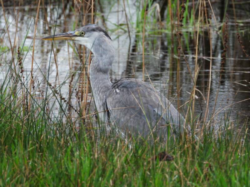 Blauwe reiger > 15-01-2022 Natuurlijk een algemeen voorkomende vogel. Het mooie is dat je vanuit de hut op de kikkerpoel kijk waar hij al vissend kikkers en salamanders naar binnen werkt. Je kunt ze ongestoord hun gang zien gaan. De vogelhut is zodanig ingericht dat je mooi zicht hebt op het weiland.