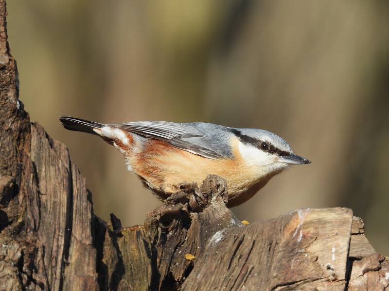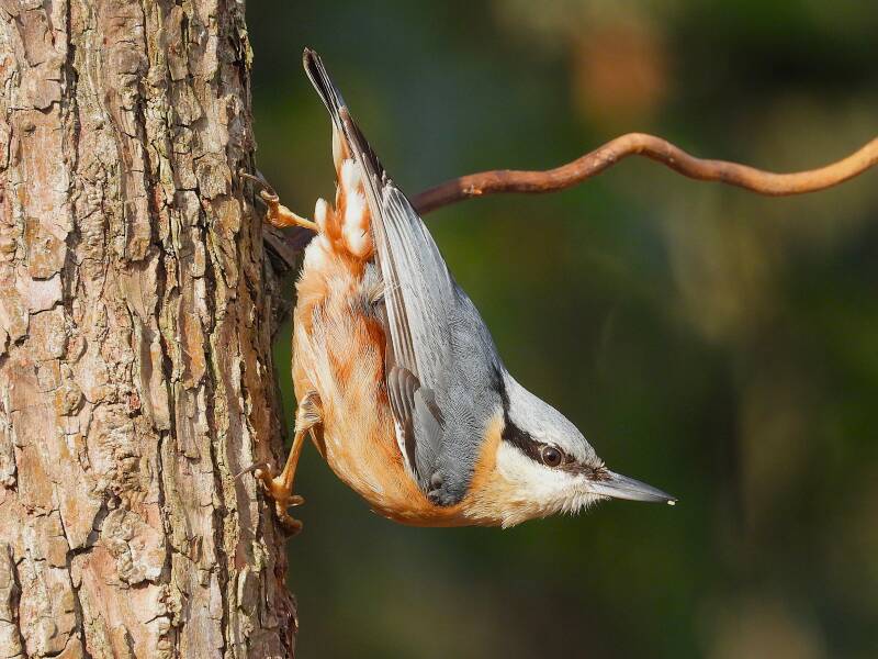 Boomklever > Een van de kleurrijkste vogels die de vogelhut bezoekt is wel de boomklever. Vliegensvlug propt hij zijn snavel vol met gepelde zonnepitten en gaat er dan weer vliegensvlug vandoor. Enkele ogenblikken later herhaalt zich dit en daarna en daarna.