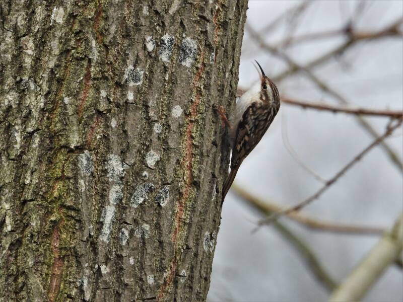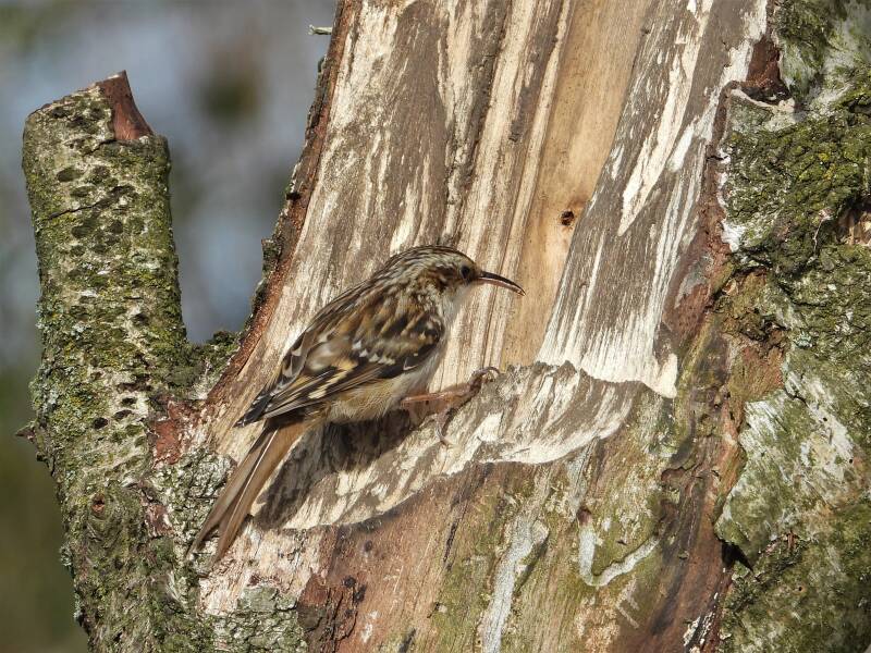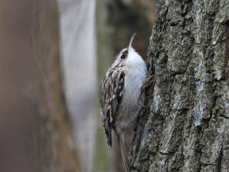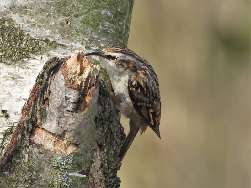 Boomkruiper > Een redelijk onopvallend vogeltje dat in tegenstelling tot de Boomklever van beneden naar boven tegen een boom opkruipt. Broedt in naald- en loofbos. Is heel beweeglijk en vliegt van de ene naar de andere boom en begind dan weer onderaan.
