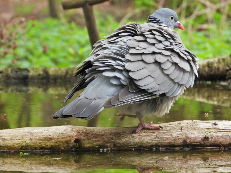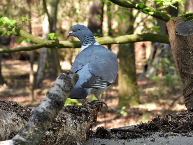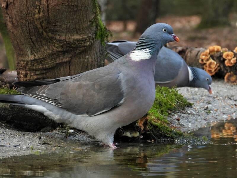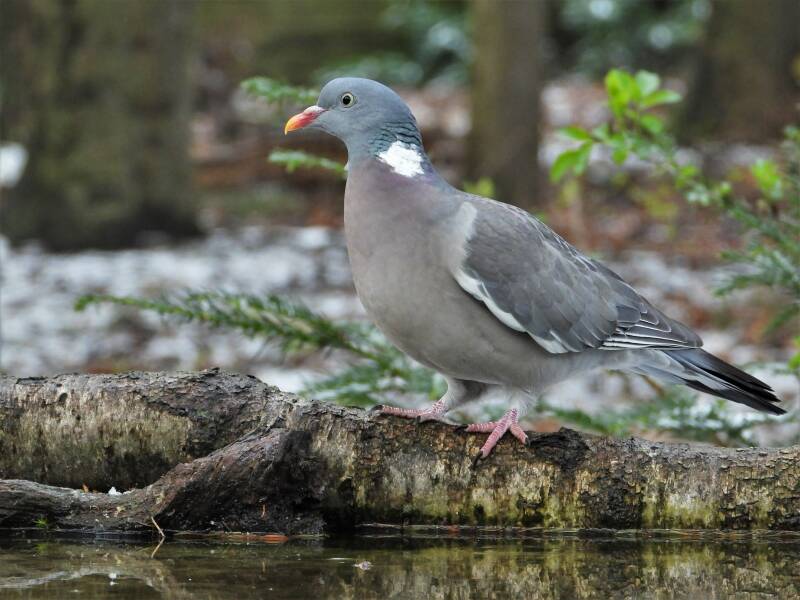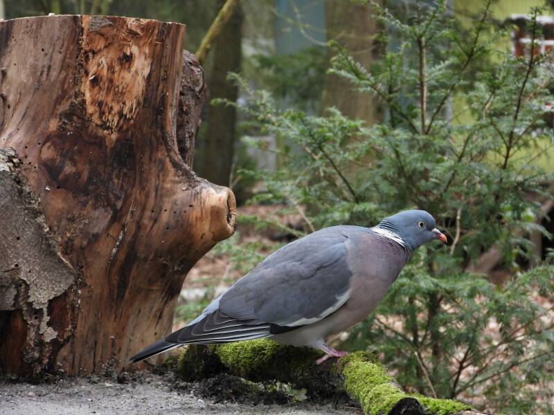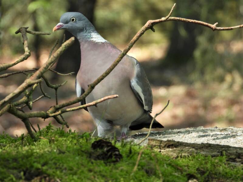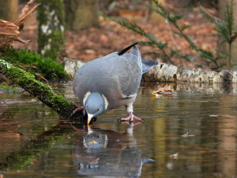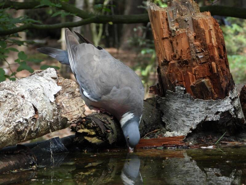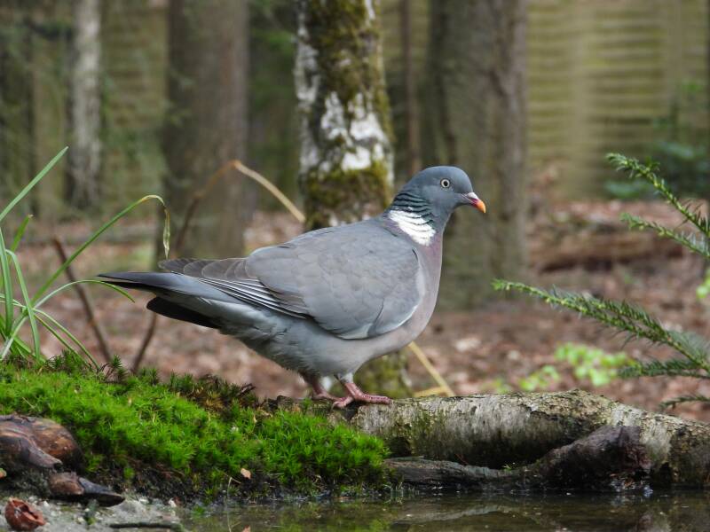 Houtduif > in het bos zit een aantal koppels houtduiven. Deze grote vogels strijken vaak met een hoop vleugelgeklapper neer bij de vijver. Ze komen daar drinken en nuttigen behoorlijk wat vogelvoer. Ze zijn erg schuw en bij iedere beweging van de cameralens gaan ze er vandoor.