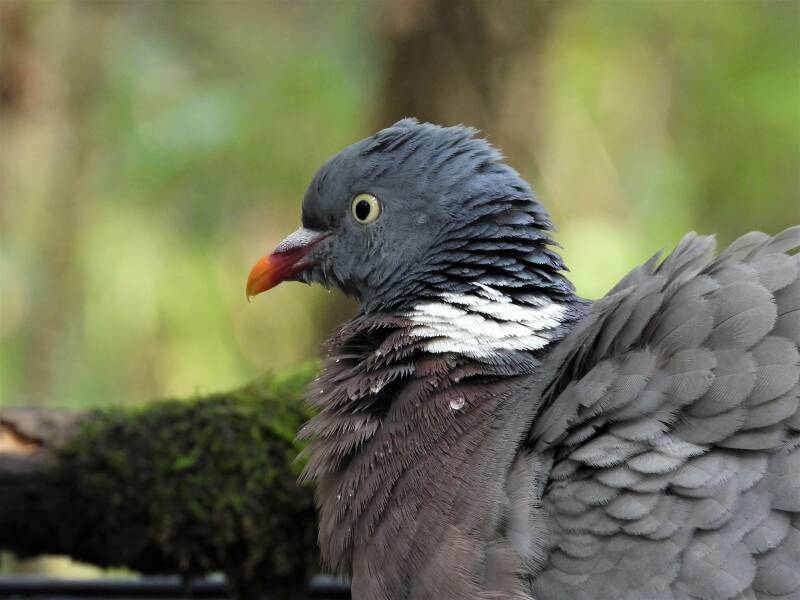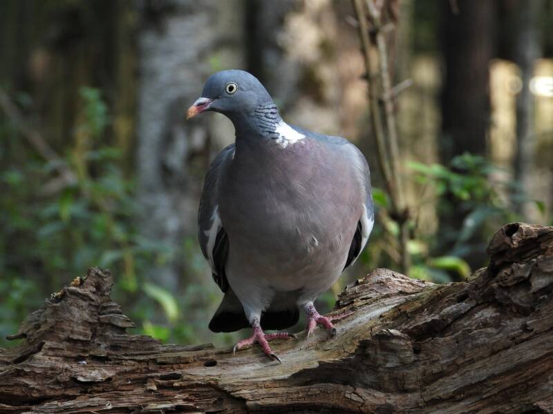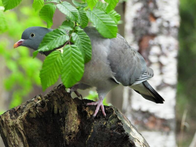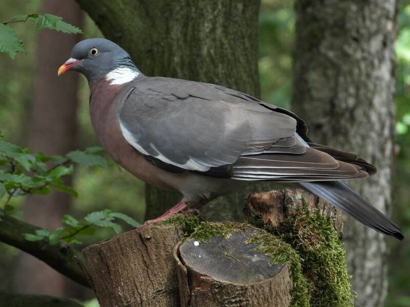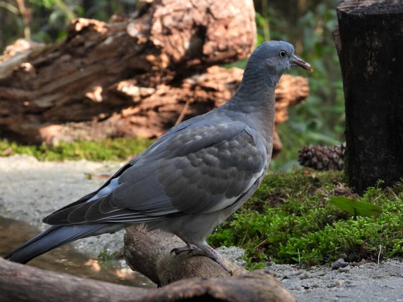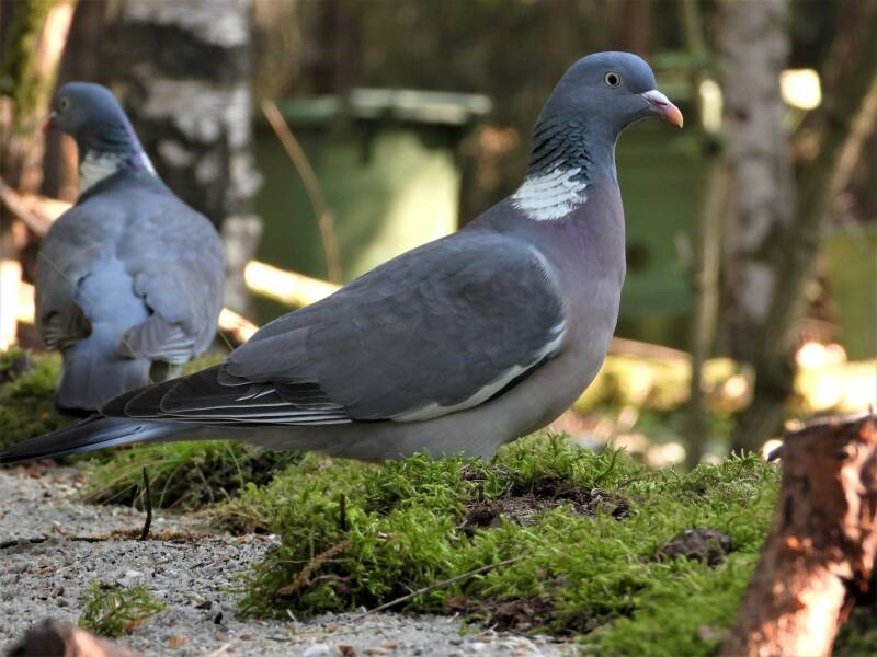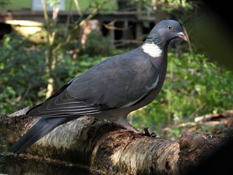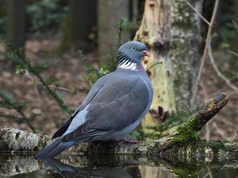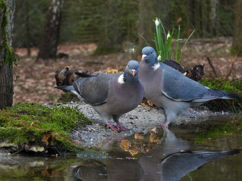 Houtduif > in het bos zit een aantal koppels houtduiven. Deze grote vogels strijken vaak met een hoop vleugelgeklapper neer bij de vijver. Ze komen daar drinken en nuttigen behoorlijk wat vogelvoer. Ze zijn erg schuw en bij iedere beweging van de cameralens gaan ze er vandoor.