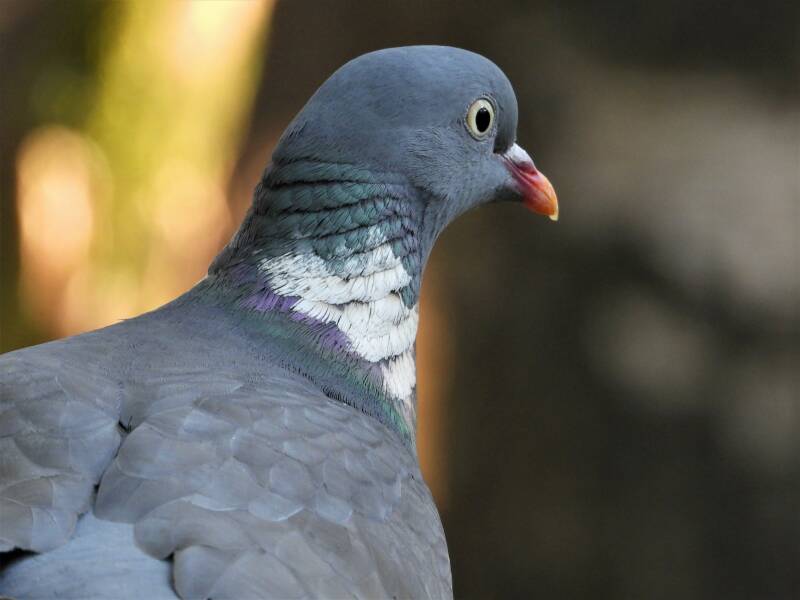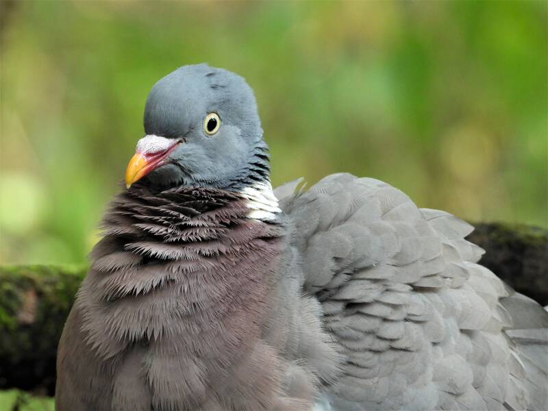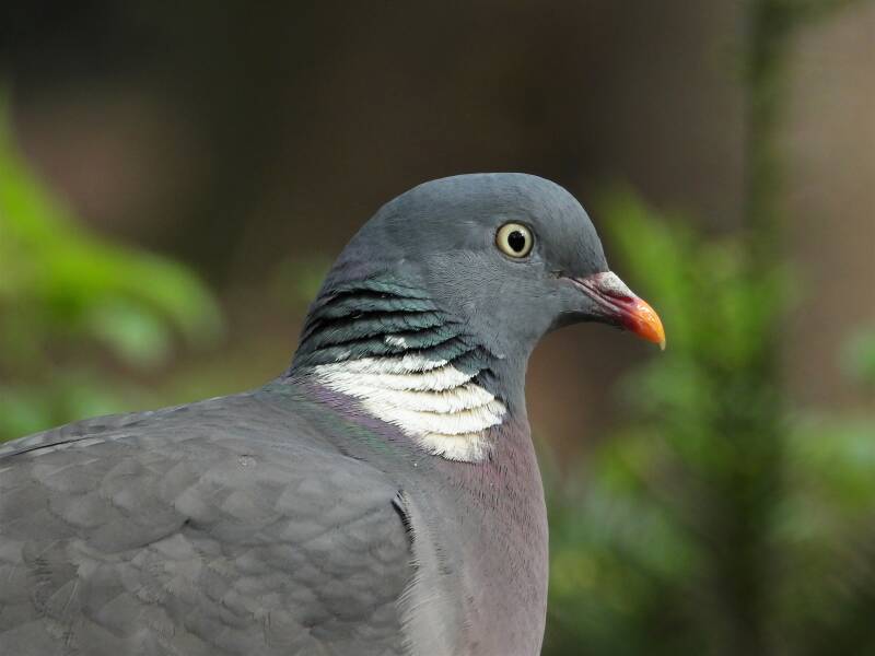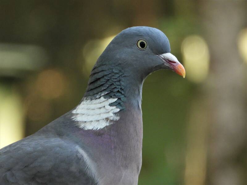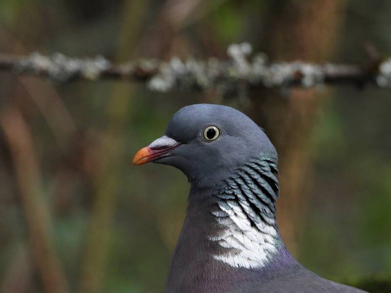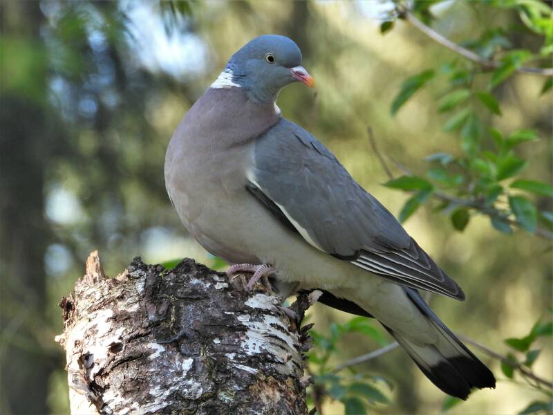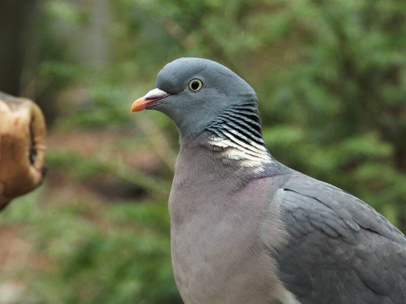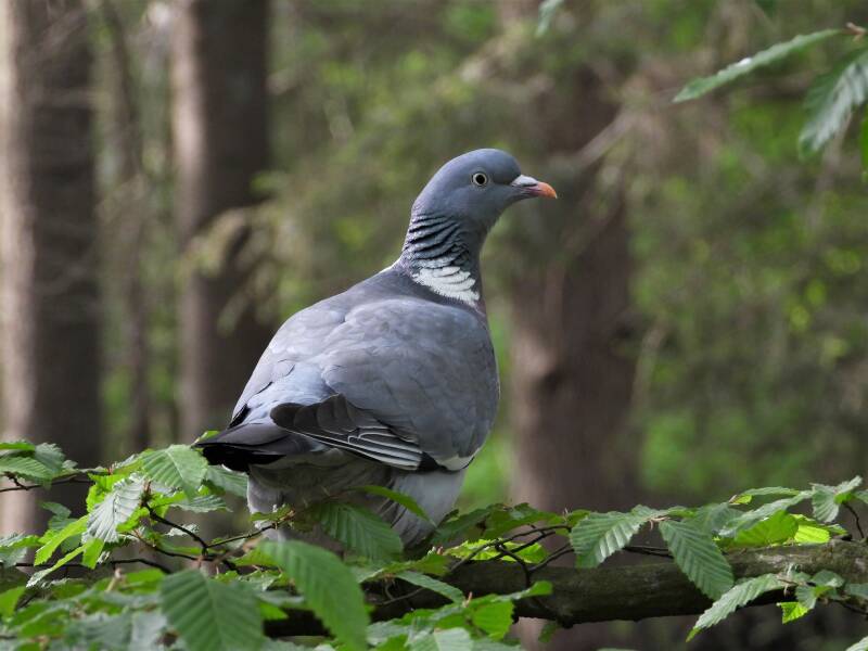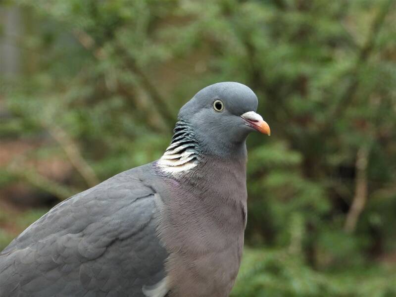 Houtduif > in het bos zit een aantal koppels houtduiven. Deze grote vogels strijken vaak met een hoop vleugelgeklapper neer bij de vijver. Ze komen daar drinken en nuttigen behoorlijk wat vogelvoer. Ze zijn erg schuw en bij iedere beweging van de cameralens gaan ze er vandoor.