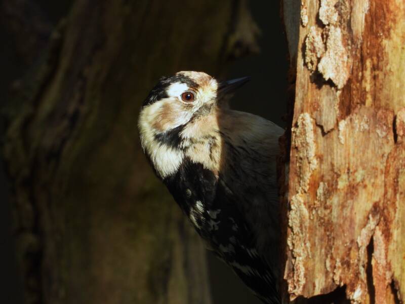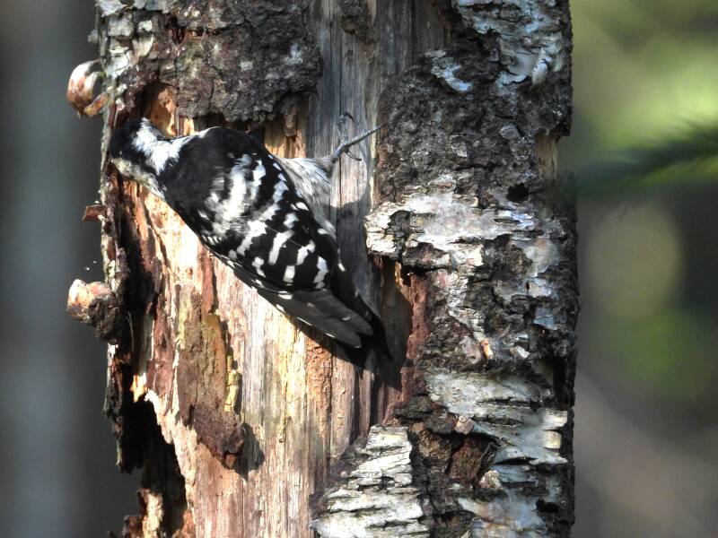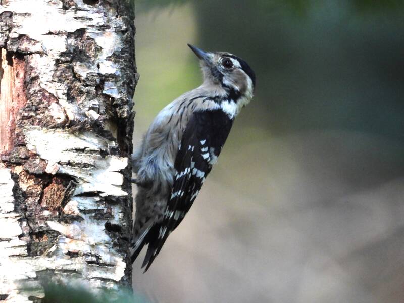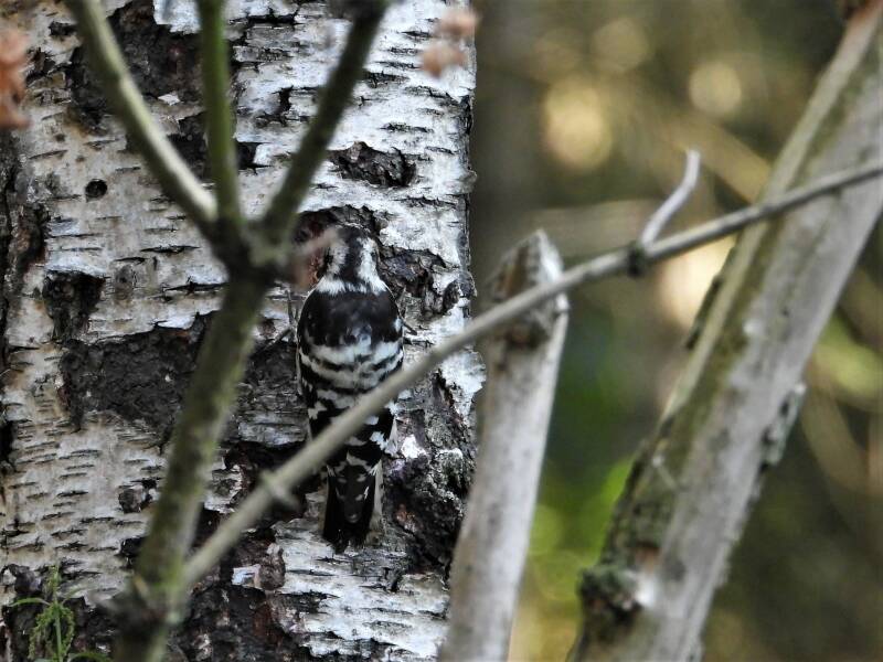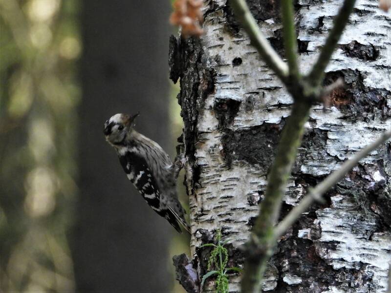 Kleine bonte specht > Naast de Grote bonte specht die veel bij de vogelhut te vinden is hoorde ik regelmatig de Groene- en Zwarte specht. Het was dan ook verrassend dat ik plotseling deze kleine spechtensoort bij de vogelhut op bezoek kreeg op de zelfde berkenstam waarin de Grote bonte specht dit jaar een gezinnetje heeft grootgebracht..