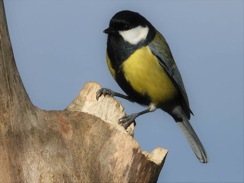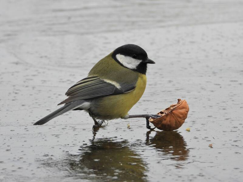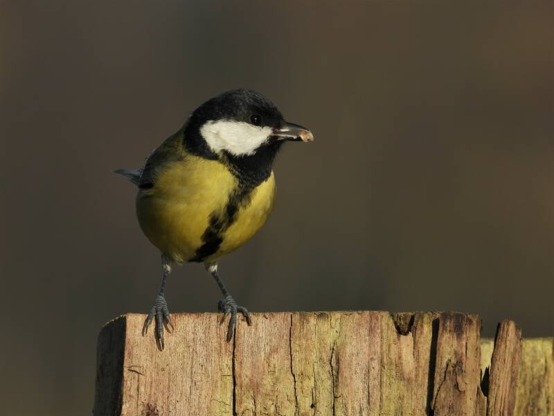 Koolmees > Het allereerste vogeltje dat van het eerste voer kwam snoepen was de Koolmees. Gemiddeld zitten er zo'n 5 à 6 rondom de hut. Ze slepen heel wat voer weg.