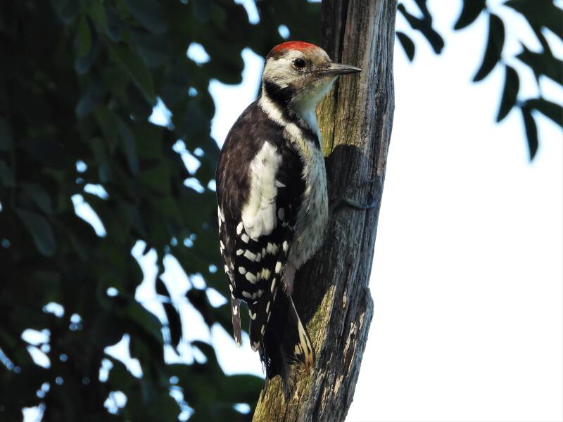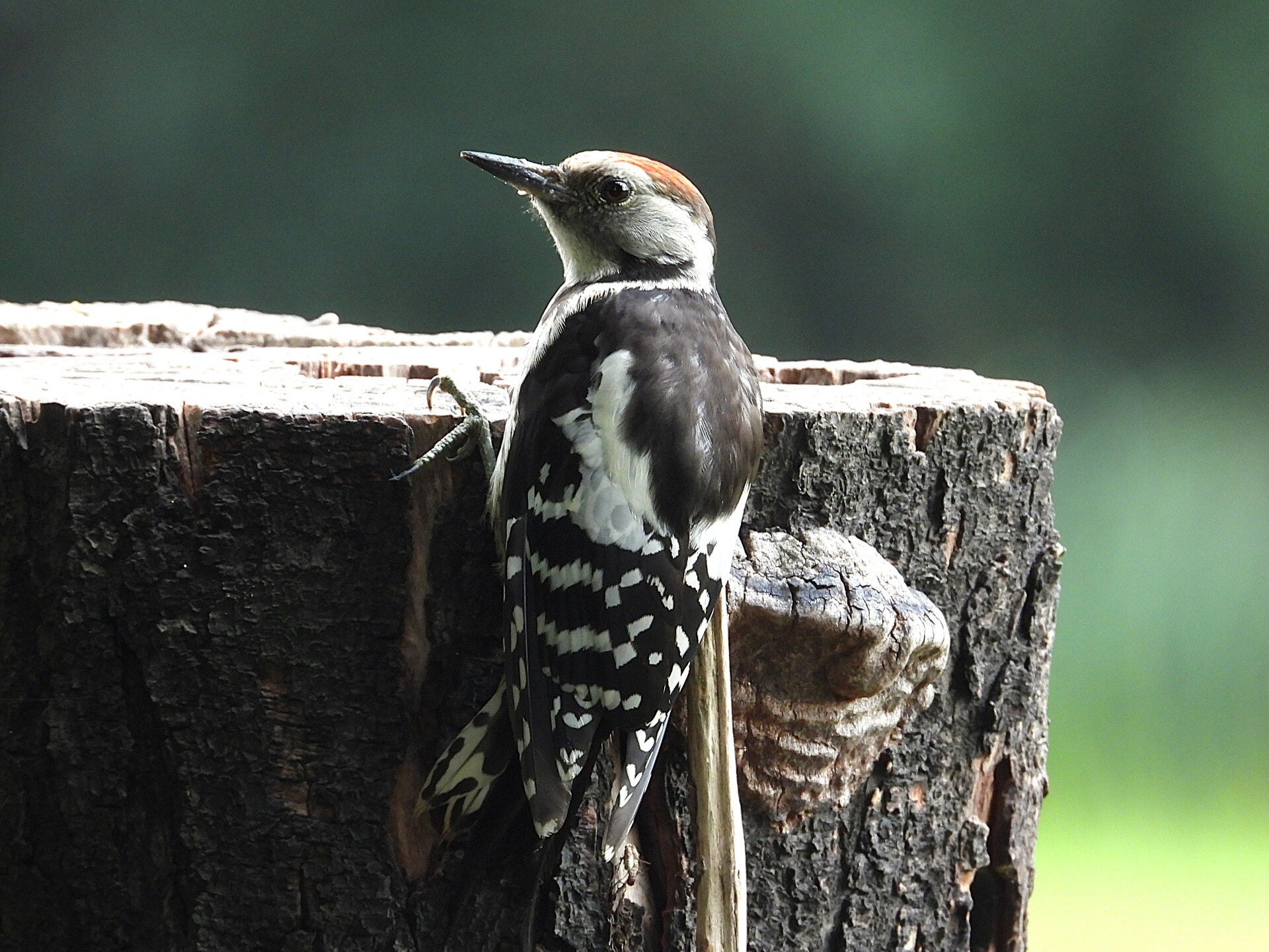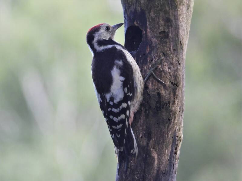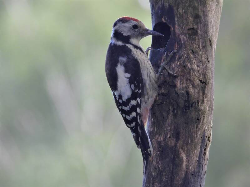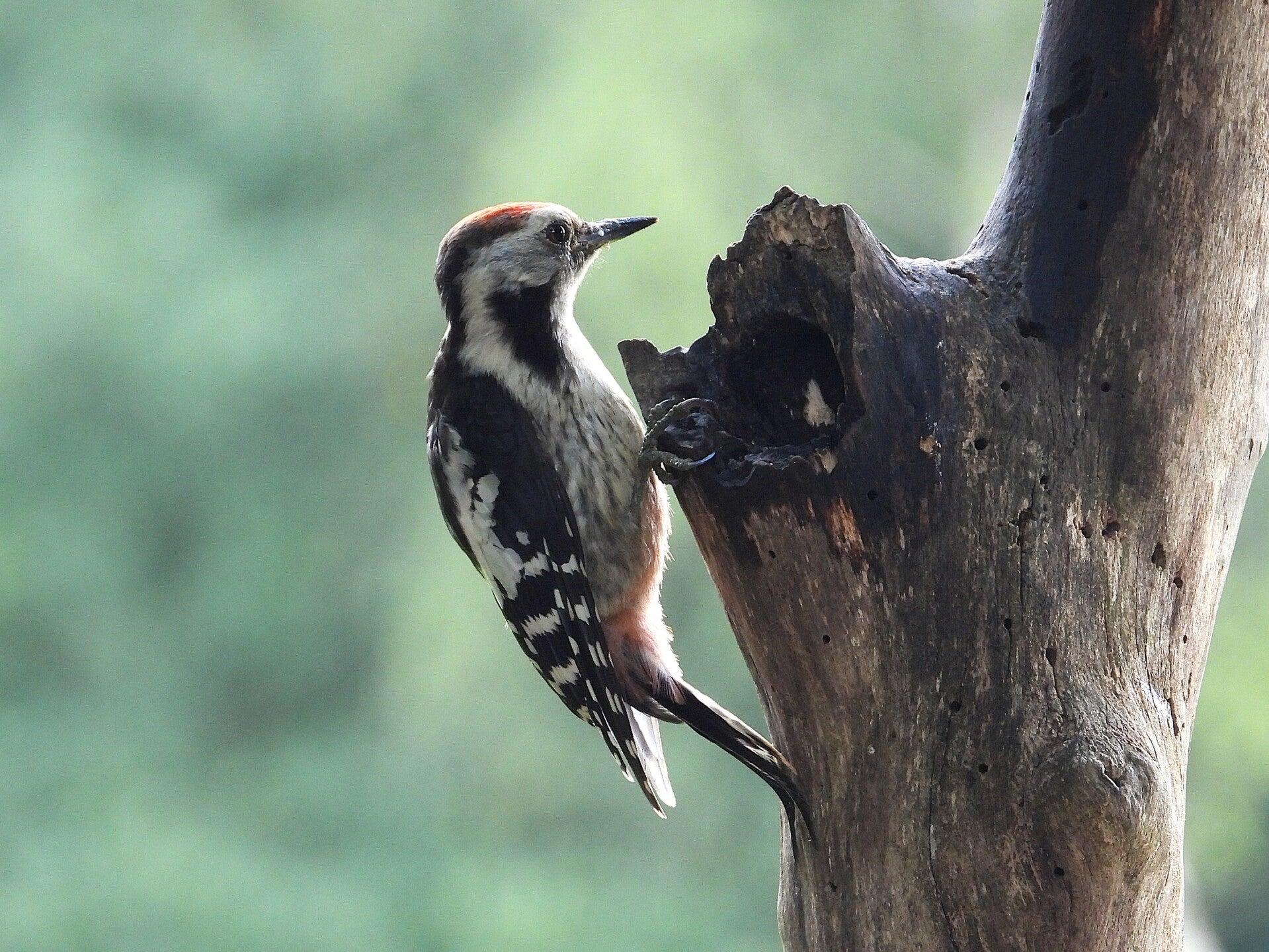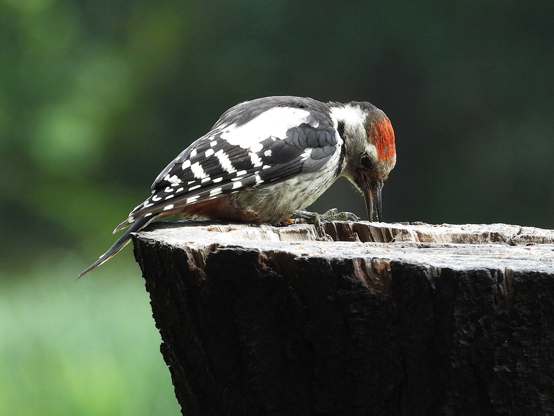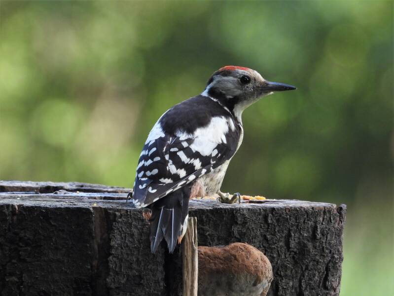 Middelste bonte specht > Deze prachtige spechtensoort lijkt het meest op de Grote bonte specht. Ze broeden in hoofdzaak in bossen met veel loofbomen. Voor het eerste bij deze hut gezien op 2 augustus 2023.