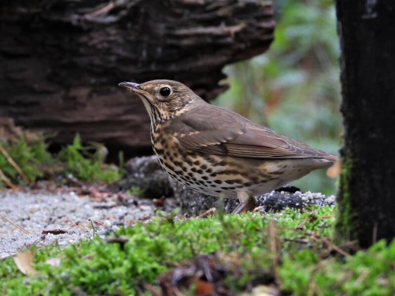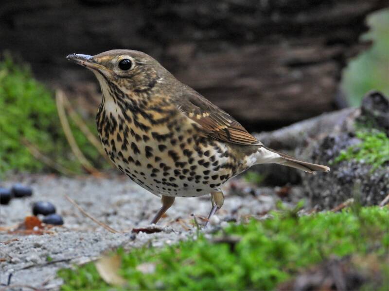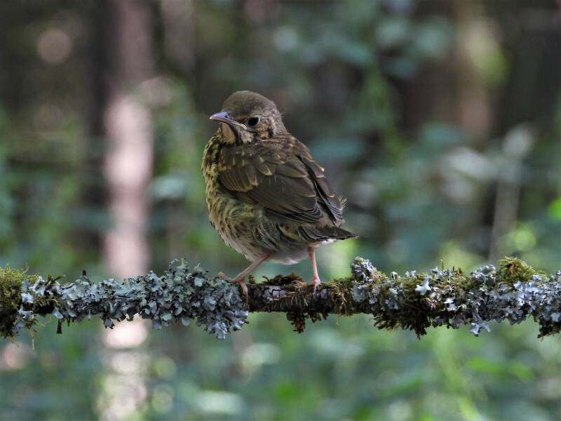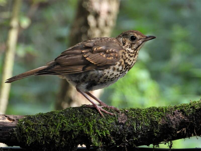 Zanglijster > Deze vogel was altijd in de buurt van de hut, struinde door het bos of zong vanaf een top van een boom. Maar zelden liet hij zich zien op de vijvertafel. Eind juli 2020 kwam een al doorgeschoten jong bijna dagelijks even een kijkje nemen.