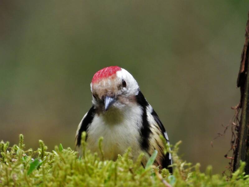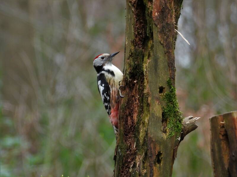 Middelste bonte specht > Broed in Nederland sinds 1977. Vrij algemeen in het oosten van ons land. Eet insecten en boomsappen. Vaak hoog in de bomen te vinden. Hakt een nestholte meestal in rottende boomstam of dikke tak.