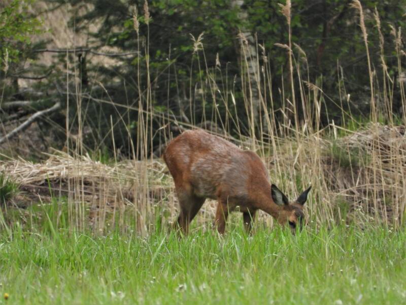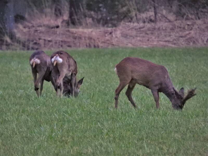 Reeën > Een mooie bijkomstigheid van de hut is de aanwezigheid van reeën die regelmatig vanuit het bos tegenover de weilanden begrazen. Vaak vroeg in de ochtend en tegen het donker zijn ze te zien.